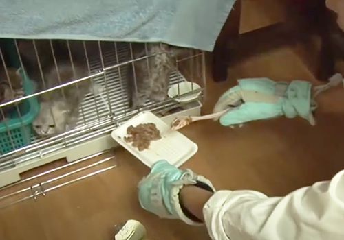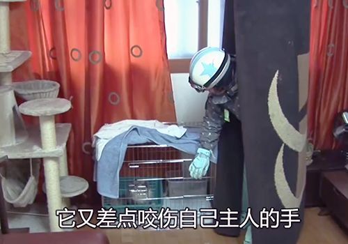 小姐姐说,这只猫咪现在对所有人都这样,对自己这个主人更加的凶。给它清理笼子时,长柄夹子会被咬住;喂食时,也要戴好手套,尽管如此偶尔还是会被猫咪抓破手。